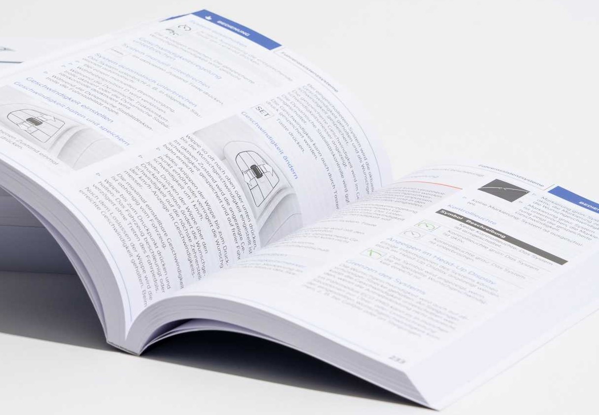 For printing on uncoated paper, coldset web printing is sufficient. If our instruction manuals are colourful and also have an image-building function, it is worth using heatset web presses. Web printing is faster and ultimately also cheaper for high print volumes. For medium print runs, sheet-fed presses work well, while digital printing is used for low print runs. Such a wide range of machinery is the domain of larger print shops.